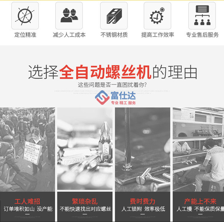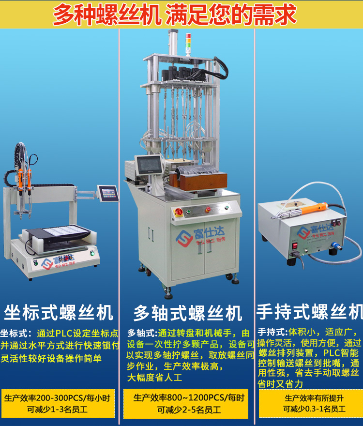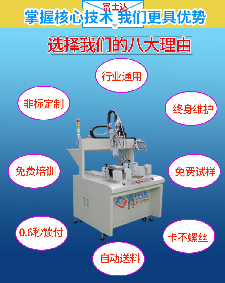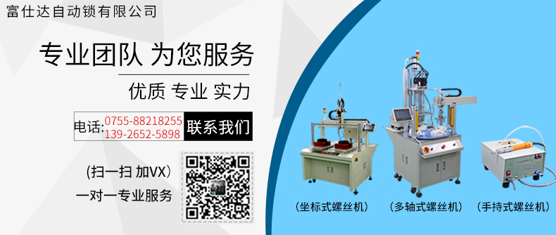 富仕達擁有獨立研發(fā)設計團隊,200多位自動化高級工程師,5000㎡自動鎖螺絲機生產、測試車間,專業(yè)售后服務團隊,為客戶提供方案設計、設備制造、操作培訓、售后服務等一站式服務。 公司將持續(xù)提升技術創(chuàng)新和產品服務方面的優(yōu)勢,堅持“專業(yè)、精工、服務”的企業(yè)理念,聚焦于自動鎖螺絲設備生產,通過系統(tǒng)的一站式解決方案,真正的幫助客戶提升效率、降低成本,提升客戶的核心競爭力。