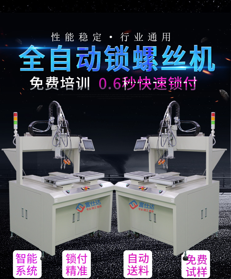 雙平臺坐標式自動打螺絲機,即富仕達雙工位全自動鎖螺絲機,設備主要由自動送釘機、逐點鎖付系統(tǒng)、PLC控制系統(tǒng)、鎖螺絲機智能控制程序等構成,通過對產品螺絲孔位X\Y\Z三維坐標點位,執(zhí)行鎖付系統(tǒng)定位,重復定位精度較高:±0.02mm,適合螺絲密集型產品及型號多樣產品生產要求。