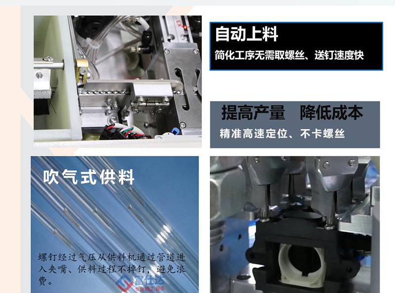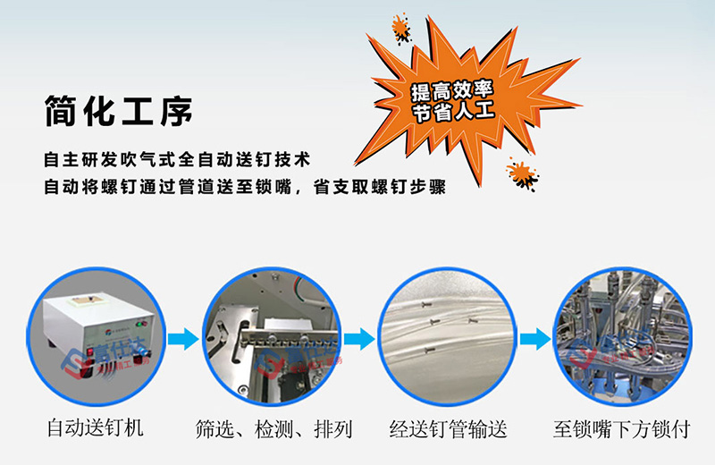 該鎖付系統(tǒng)可等同為全自動鎖螺絲流水線,通過四個工作站的作業(yè),將百葉窗扇葉通過螺絲緊固在框架內(nèi)的指定位置,螺絲采用自主研發(fā)吹氣式自動送釘機,直接輸送至鎖付機構(gòu);扇葉通過專用治具與框架定位,需手動放置;鎖付系統(tǒng)采用水平雙方向同時作業(yè),配置4把電批位于兩側(cè),一次擰好4顆螺絲;移動式作業(yè)臺根據(jù)程序設(shè)定,逐點向前推進(jìn)并自動擰螺絲。
